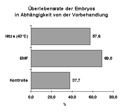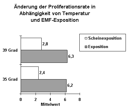 Velizarov und Kollegen untersuchten die Wirkung hochfrequenter Felder von 960 MHz mit einer Pulsung von 217 Hz (GSM-Standard) auf die Zellteilung in einer Zellkultur menschlicher Amnion-Zellen. Die spezifische Absorptionsrate (SAR) betrug 2,1 µ W/g, die Expositionsdauer 30 Minuten. Zur Klärung der Frage, ob die Temperatur eine Rolle beim Einfluss auf die Zellteilungsrate hatte, wurden die Untersuchungen mit jeweils 11 Zellkulturen bei zwei verschiedenen Temperaturen - bei 35 und 39 ° C - durchgeführt. Daneben wurden Scheinexpositionen (keine EMF-Exposition) durchgeführt und Kontrollkulturen angelegt (siehe Tabelle und Grafik 1).