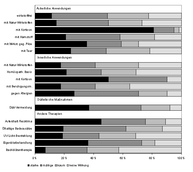 Vor dem Hintergrund, daß sowohl die aktuelle Beeinträchtigung durch die atopische Dermatitis als auch die Einschränkung der gesundheitsbezogenen Lebensqualität der Kinder, beispielsweise im Vergleich zu Patienten, die sich in stationärer Behandlung befinden, gering ist, können die vorliegenden Angaben zur Inanspruchnahme und Wirksamkeitsbewertung vorsichtig dahingehend interpretiert werden, daß bei vielen Kindern im Verlauf ihrer chronischen Hauterkrankung zumeist erfolgreich individuelle Therapiestrategien entwickelt werden konnten, die sich hauptsächlich auf eine Kombination bereits etablierter Behandlungsverfahren konzentrieren.