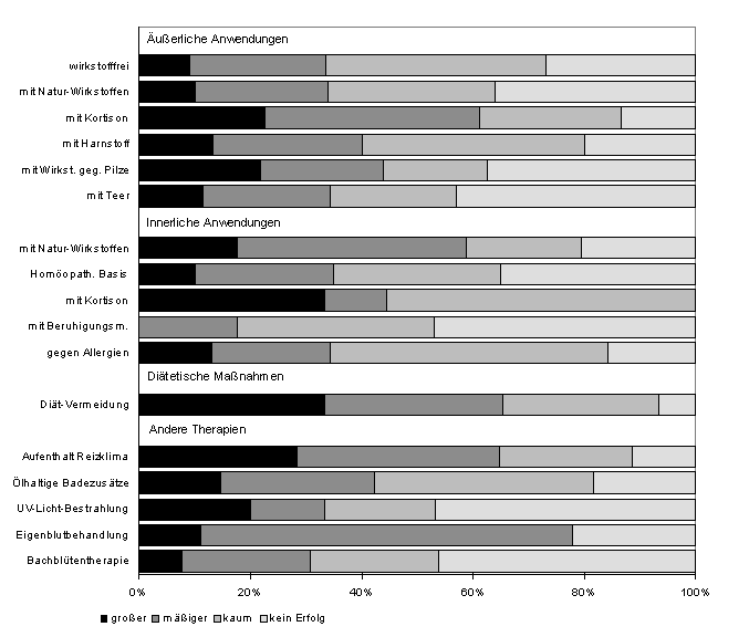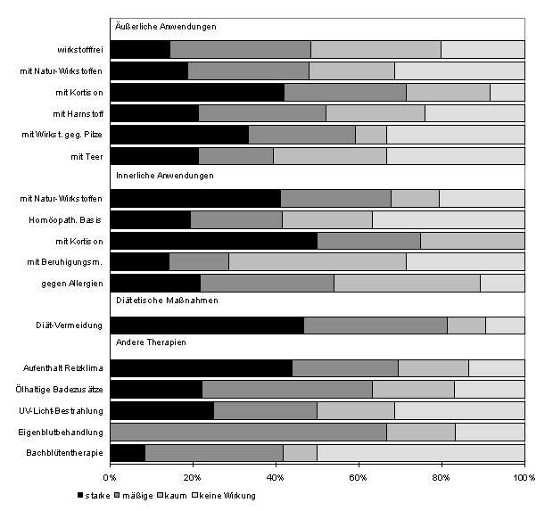 Unter den anderen Therapieformen zeichnen sich besonders die Eigenblutbehandlung, die Vermeidung einzelner Nahrungsmittel sowie Aufenthalte im Reizklima als erfolgreiche Maßnahmen aus. Zwischen 77,8% und 64,8% der Eltern, deren Kind eine dieser Therapieformen angewendet haben, schätzen den Erfolg der Maßnahme als "mäßig" oder "groß" ein.