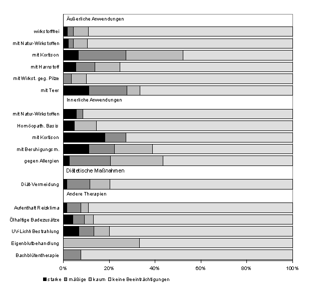 Bei neun der berücksichtigten Therapien schätzen jeweils weniger als 10% der Eltern, deren Kinder eine der Behandlungsmaßnahmen angewendet haben, die aufgetretenen Nebenwirkungen bzw. Beeinträchtigungen als mäßig oder stark ein. Dazu gehören die ölhaltigen Badezusätze (9,1%), Präparate auf pflanzlicher Basis zur inneren Anwendung (8,6%), Aufenthalte im Reizklima (7,7%), die Bachblütentherapie (7,7%), die Homöopathika (4,8%), die wirkstoffreien Externa (4,5%), Externa mit Wirkstoffen aus der Natur (4,2%) die Antimykotika (3,3%) sowie die Eigenblutbehandlung (0,0%).