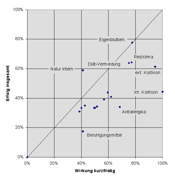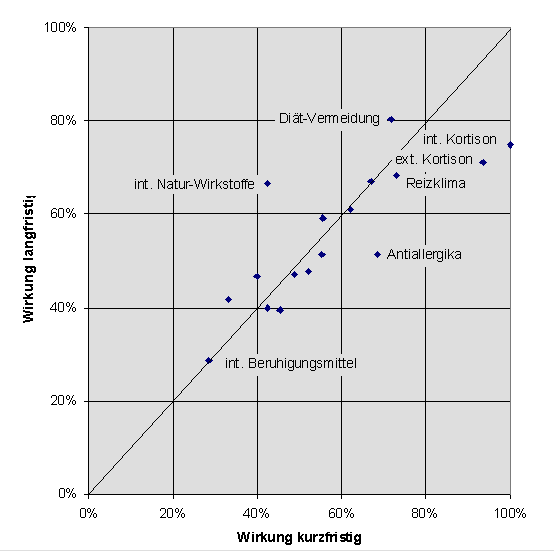 Allerdings spiegeln sich die in der Fachliteratur breit belegten Nebenwirkungen nach bzw. während längerfristiger Anwendung kortisonhaltiger Präparate sowie die im Vergleich zur kurzfristigen Wirksamkeit an sich immer noch respektable, aber doch deutlich geringere längerfristige Wirkung in der elternseitigen Bewertung wieder. So wird kortisonhaltigen Therapeutika nicht nur mit das höchste Nebenwirkungs- bzw. Beeinträchtigungspotential zugeschrieben, dieses Nebenwirkungspotential scheint auch, in Verbindung mit der eingeschränkteren längerfristigen Wirksamkeit, dafür verantwortlich zu sein, daß die Eltern verschiedene andere Maßnahmen und Verfahren (Eigenblutbehandlung, Vermeidung einzelner Nahrungsmittel, Aufenthalt im Reizklima) als insgesamt erfolgreicher bewerten als kortisonhaltige Präparate.